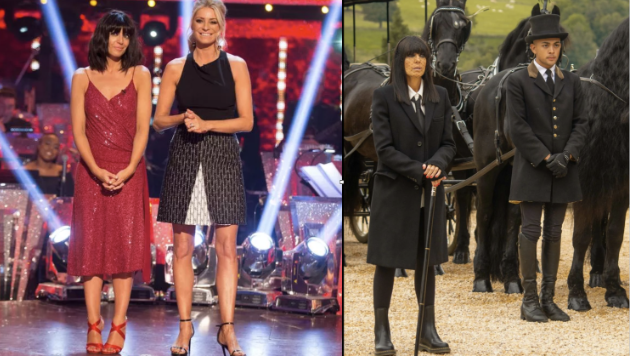 left - Claudia Winkleman and Tess Daly, Strictly Come Dancing, right - Claudia Winkleman and pallbearer, The Traitors